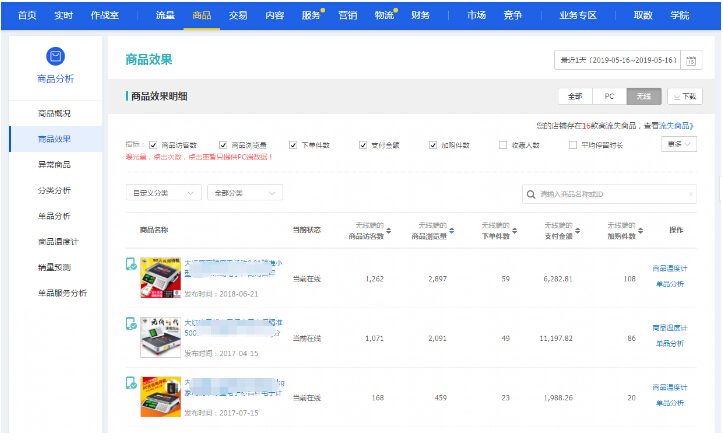 生意参谋的商品效果里面可以看到单款产品每天的各项数据像访客数收藏加购数如下图主要看无线端从这些数据可以看到目前店铺主要是哪几款在引流量流量进来后产生的收藏加购转化数据情况如果每天访客数达到200以上的可以从这里来看主要看流量集中在哪几款的产品上主要看搜索流量访客数。